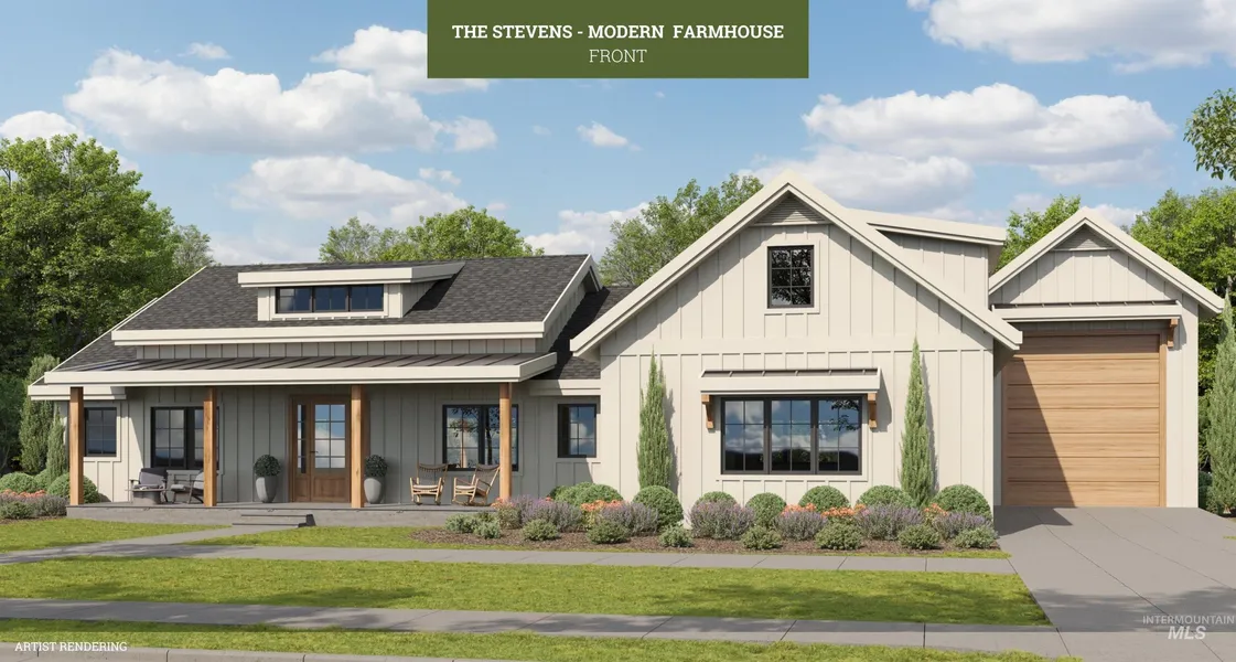 The Stevens is a modern country home with a charming covered front porch. Its vaulted great room is bathed in natural light from carefully placed windows, offering serene views throughout. The split-bedroom layout is centered around a spacious great room with a striking wall of windows, while an upstairs bonus room adds flexibility for work or leisure. Standard features include 8' doors, a gas fireplace in the great room, quartz kitchen countertops, Bosch stainless steel appliances, LVP flooring, and premium carpet. Smart home upgrades add convenience, while a gas line stub on the back patio makes outdoor cooking easy. A 50' RV garage provides ample storage. Located in Middleton’s Waterbrook Farms, this exclusive community features 26 homesites in a peaceful country setting, just moments from Purple Sage Golf Course.