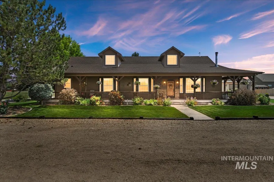 No HOA or CCRS! This gorgeous house is tucked away from the road down a long lane. Sweeping porches surround the front and side and look out over green lawn and garden boxes. The spacious floor plan features lots of natural wood and has something for everyone Large kitchen with walk in pantry and breakfast bar. Wood stove in the great room can heat the house. Primary suite has large walk in shower, separate tub and plenty of closet space. All bedrooms are good sized. Bonus room and bathroom upstairs could easily be 4th bedroom with private bath. Outbuildings include a large shop, a small shop, barn and animal shelters. Plant your own produce in the garden boxes, store all your tools in the tool shed. This property has a place for everything. Bring your RV, travel trailer, utility trailer, anything you want to park is welcome here. Any animals are allowed. Within 2 blocks of charter schools, easy drive into town shopping and medical. Nampa Meridian irrigation water