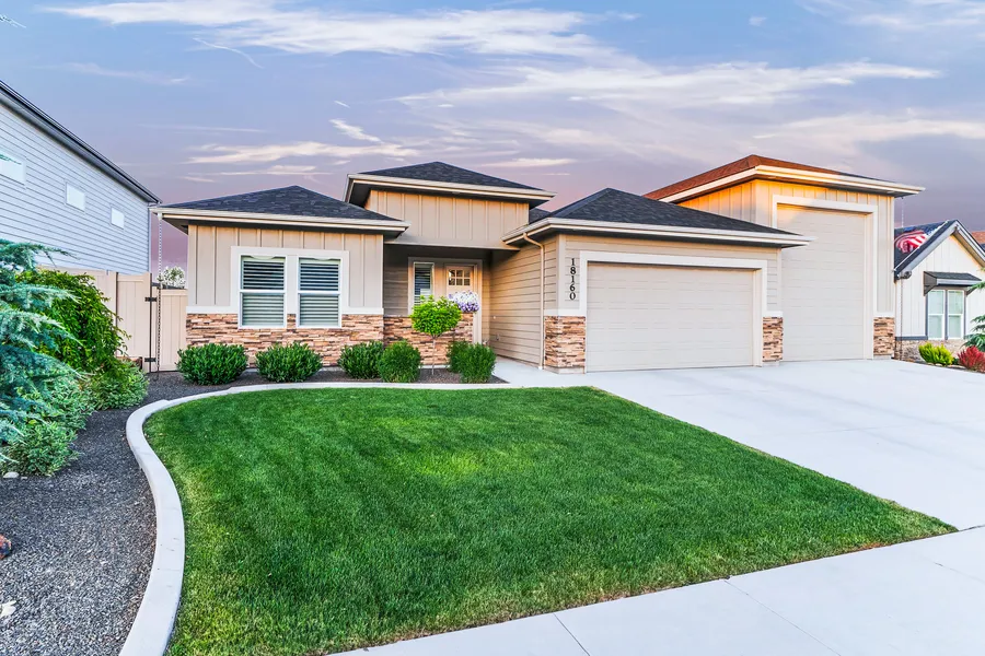 This beautifully crafted home, built in 2023 by Sunrise Homes of Idaho, blends modern comfort with timeless design including 10ft ceilings and abundant natural light. The open-concept kitchen is a standout, featuring a large quartz island, soft-close cabinetry, and a spacious, full appliance pantry. The adjoining great room includes elegant, beamed ceilings and a striking floor to ceiling stone gas fireplace, creating a warm and inviting space for gatherings. The primary suite serves as a peaceful retreat with a spa-like bathroom complete with dual vanities and a walk-in shower. In addition to 3 bedrooms, the versatile office space is ideal. Outdoor living is impressive, with a large, east facing covered patio ideal for entertaining or slow mornings. Additional highlights include a finished garage with a massive 53-foot RV bay, plus a conditioned crawl space for enhanced energy efficienc...