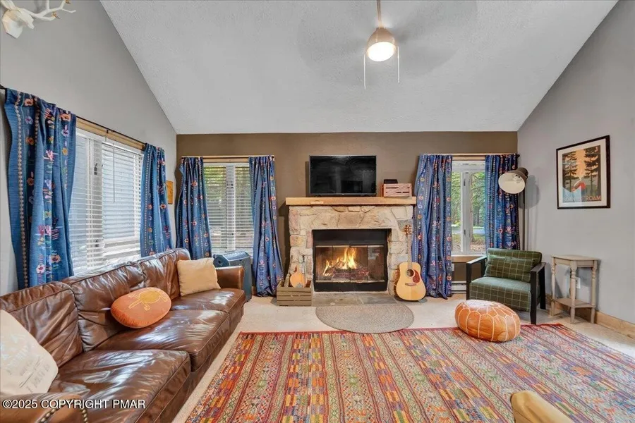 Welcome to Snow Ridge Village in Lake Harmony! This 3-bedroom, 2-bath STANDALONE SUMMIT TOWNHOME sits on a QUIET CUL-DE-SAC AND is offered FULLY FURNISHED, with exclusive access to the members-only BOULDER LAKE CLUB. The open-concept layout features VAULTED CEILINGS, a stone WOOD-BURNING FIREPLACE, and a gallery-style kitchen with oak cabinetry. The dining area opens to a PRIVATE DECK, and the first-floor primary suite includes dual closets, a RENOVATED EN-SUITE BATH with dual vanity and glass shower, plus a PRIVATE HOT TUB ROOM. Upstairs offers a SPACIOUS LOFT BEDROOM, a second guest bedroom, and a BONUS HIDEAWAY ROOM—perfect for kids or extra storage. STR-FRIENDLY AND ideally located near JACK FROST MOUNTAIN, Jack Frost National Golf Course, and all the amenities of Lake Harmony and the Poconos!