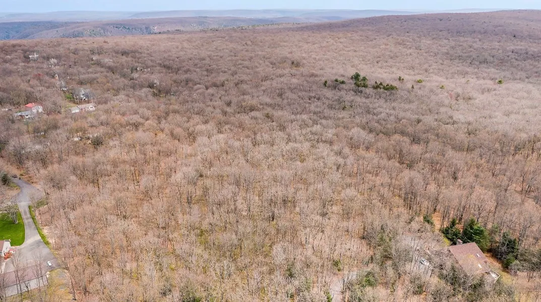 Corner lot for sale on 43k sqft of vacant land in Carbon County, Pennsylvania. You can access the lot via the 470 ft road frontage on Panther Run Rd and Dilldown Dr. The terrain is completely leveled and covered in trees, with electricity poles located next to the property.