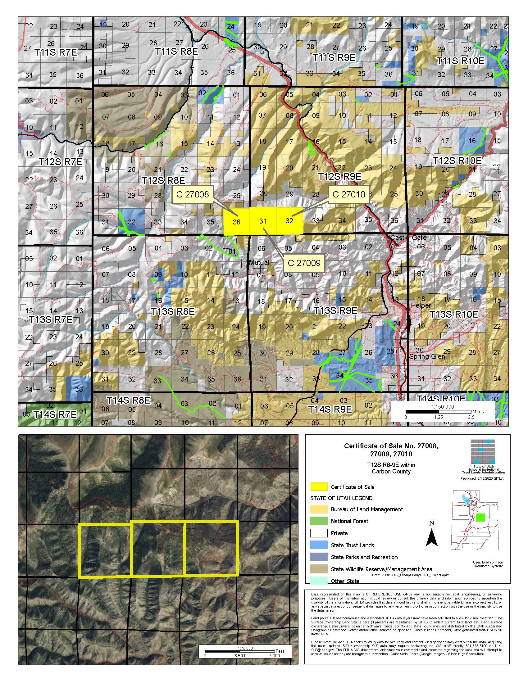 Utah State School and Institutional Trust Lands Administration (SITLA) is selling 3 sections of land near the town of Helper in Carbon County at a public auction to be held online June 8-13, 2023. The average elevation for the properties is 8,332 feet with gradual to steep slopes on the south-facing ridge that separates Spring Canyon (south) from Crandall Canyon (north). The properties will be sold as 3 separate parcels. Parcel 1 contains 642.33 acres with a minimum price of $481,750.00. Parcel 2 contains 686.92 acres with a minimum price of $515,200.00. Parcel 3 contains 662.20 acres with a minimum price of $496,650.00. Financing is available.