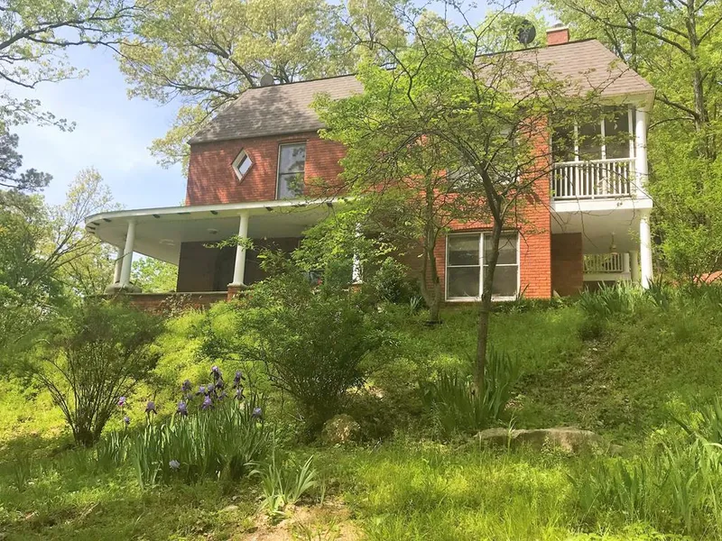 This elegant custom built home is surrounded by over 25 acres of undeveloped woods, and stunning stone outcroppings. Tucked away in the valley, but easily accessible to town, it offers the perfect combination of serenity, privacy and convenience. This lovely 4 bedroom brick home was crafted with special features that include arched doorways, brick and hardwood floors, huge fireplace, 2 staircases and 5 inviting (some screened) porches. With multiple interior living spaces, the layout of the house allows for easy entertaining as well as great spaces to chill out for an afternoon. A separate electrified and insulated shop/studio, a space for potential garden, kids area or entertaining will allow you to create a special environment for you ,your family and friends.