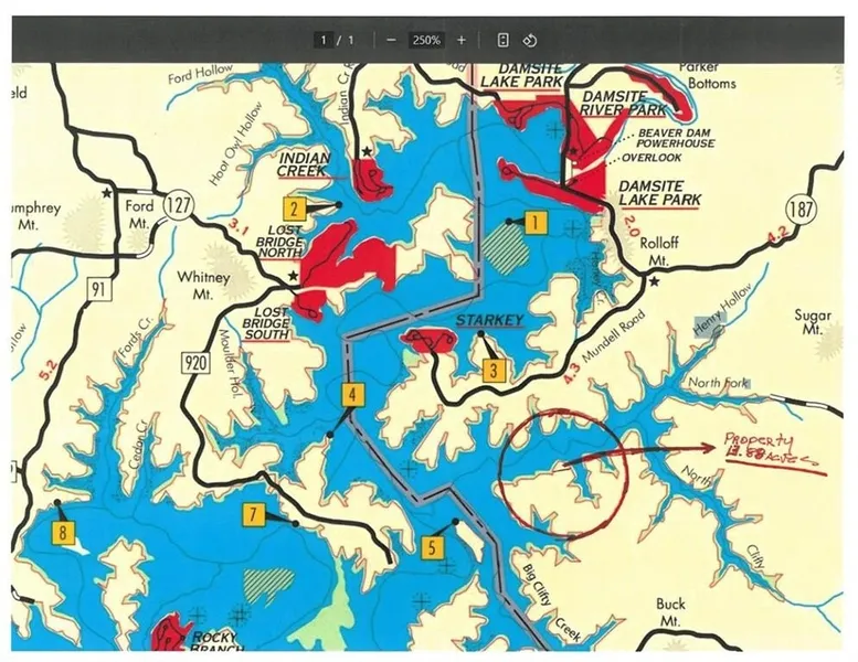 2000 ft of lake frontage. Awesome lake views from the hillside property of the north clifty channel and toward the main lake channel. This mountain top property is near the upper end of the lake. 13.88 acres m/l. Totally wooded. Has private gravel road access. Will require a well but private water is nearby. Great building sites, on terrain that is sloped steep on top to gentle to the water's edge. A mix of private and semi-private wooded areas, winter views, or total view with clearing. Some nice hardwoods on the property. Maybe some rock exposure too. Adjacent to Oak Ridge Park subdivision, mainly a wooded subdivision. The closest marians are starky marina and lost bridge marina. A survey is attached. The property is approx. 40+ miles from either Fayetteville, Rogers, Bentonville, and Bella Vista; potentially apx a 1 hr drive. Apx 15 minute drive from Eureka Springs for ease of shopping and entertainment. First time on the market since the development of Beaver Lake. Pretty much untouched.