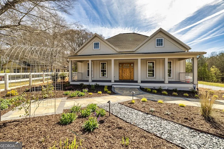 This stunning historic farmhouse has been completely renovated, preserving its timeless charm while offering modern comforts. Nestled on 7.8 fenced and gated acres, this property provides both privacy and potential for additional home sites. Thoughtfully designed landscape lighting enhances the beauty of the home and its upgraded landscaping, creating a warm and inviting ambiance. Step onto the expansive front porch and into a beautifully updated interior featuring an open-concept floor plan with a spacious kitchen and breakfast area-perfect for entertaining. The primary suite on the main level boasts a luxurious upgraded bath and a generous walk-in closet. Two additional bedrooms share a beautifully renovated full bath in the hallway. With top-to-bottom updates, this home seamlessly blends historic character with modern convenience, making it feel like new. Don't miss this rare opport...
