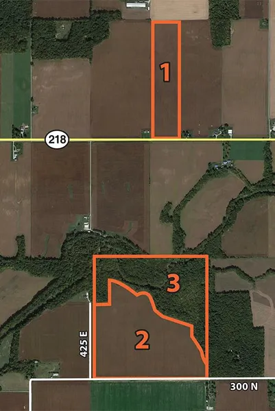 Legal Description: 40 +/- acres located in the W 1/2 of the W 1/2 of the SE 1/4 of S17, T25N, R1E, Washington Twp; 78.435 +/- acres located in the E 1/2 of the NW 1/4 of S13, T25N, R1E, Jackson Twp; 160 +/- acres in the E 1/2 of the SW 1/4 and the W 1/2 of the SE 1/4 of S20, T25N, R1E, Carrollton Twp; 73.829 +/- acres located in the W 1/2 of the NE 1/4 of S17, T24N, R1E, Carrollton Twp; 79.951 +/- acres in the W 1/2 of the NW 1/4 of S24, T24N, R1W, Monroe Twp; all located in Carroll County, State of Indiana.