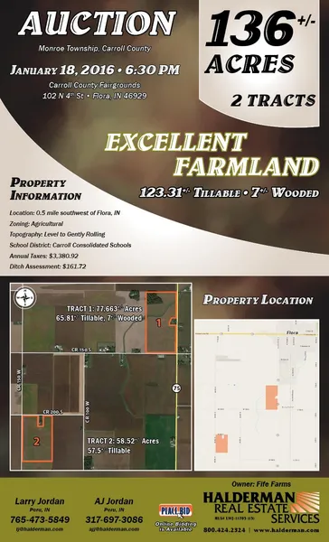 Legal Description: 77.663 acres, more or less, located in the W 1/2 of the NE 1/4 of S16, T24N, R1W and 58.52 acres, more or less, located in the W 1/2 of the NE 1/4 of S20, T24N, R1W, all in Monroe Twp of Carroll County, State of Indiana.