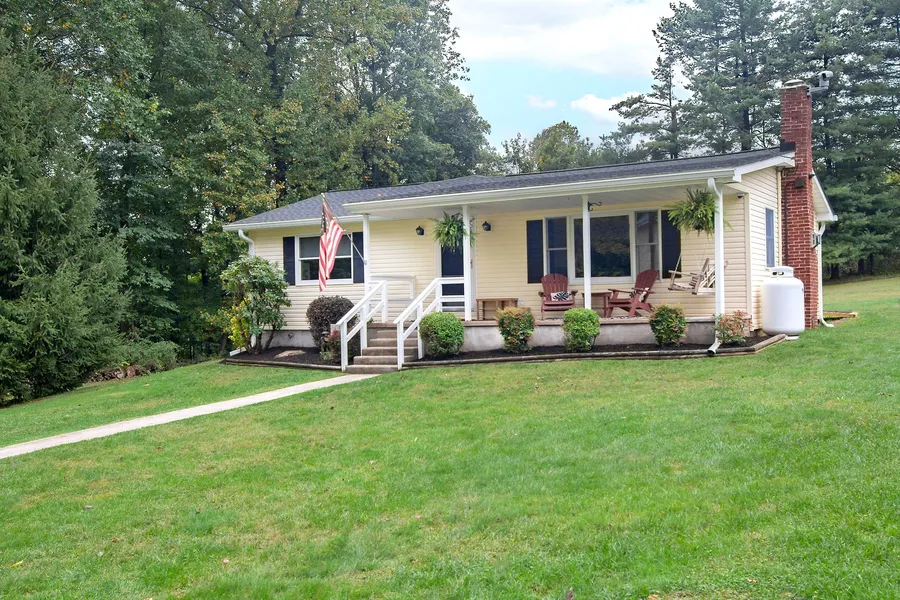 This property feels like a little slice of heaven, exuding privacy, charm, and tranquility. A beautiful drive through the woods leads to this quaint ranch-style home with a two-car detached garage, nestled on one and a half acres. Step onto the inviting 8-foot by 20-foot covered porch, which opens into a spacious living room with an open floor plan. The living and dining areas are warmed by a gas fireplace, creating a cozy atmosphere. Nearby, a stunning, updated kitchen features custom maple cabinets, a pantry, granite countertops, a subway tile backsplash, and a perfectly sized island for all your cooking needs. A charming breakfast nook overlooks the expansive rear yard and deck. The large primary bedroom offers ample space, natural light, a walk-in closet, and an updated en-suite bathroom. The additional bedrooms are generously sized and conveniently located near the updated hall bath...