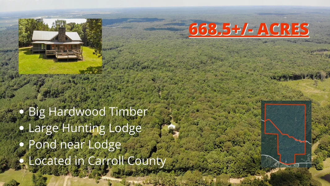 Are you Looking for a turn key deer and turkey hunting property that has everything? if so, this is it! This property is located about 15 minutes south of Greenwood in the Carrol County Hills. This property is covered with BIG MATURE hardwood timber and has a lodge that is to die for! If you have been looking for the perfect weekend getaway for the family that also has tons of deer and turkey. Give me a call so we can set up a showing. This property is 668.5 Acres, the lodge is 3,000 +/- Sq. Feet and the outdoor shop is plenty big enough for whatever you can throw at it.