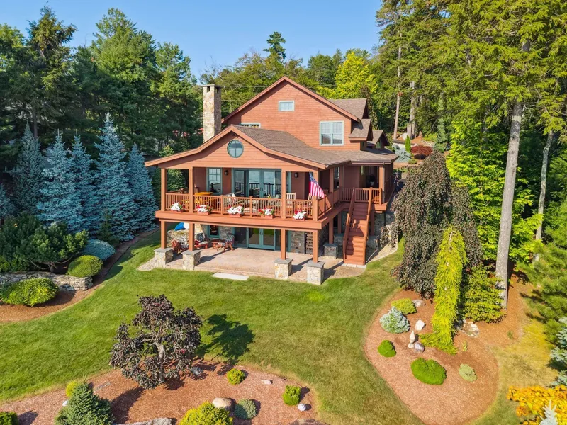 Rarely is a home offered that combines panoramic western exposure and an exceptional attention to detail in design. Westview Lodge on Lake Winnipesaukee is now being offered for the first time. The Adirondack inspired home combines open concept living along with outdoor entertaining. The first floor has a gourmet kitchen with Wolf appliances which opens to a dining area and great room. The stone fireplace creates a focal point with custom built ins on either side. The large glass sliding doors on the main floor lead out to a covered deck that can easily allow for large family gatherings. The first floor primary suite makes one level living a snap. The second floor has two guestrooms and a large open loft than can be an office or additional sleeping area. The walkout lower level has a large family room and exercise room. The changing room and bathroom is ideal for people coming from the l...