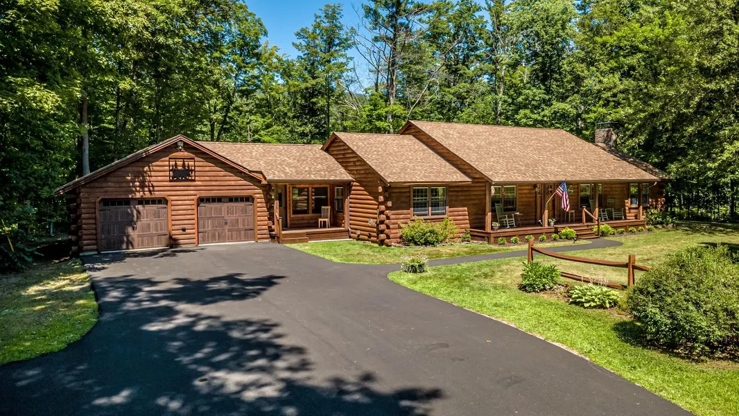 Just a short stroll from Bartlett Village, this stunning Lincoln Log home sits on nearly 9 acres of natural beauty with an incredible 1,000 feet of Saco River frontage. Inside this single-level White Mtn oasis you will find 2 bedrooms, 2 baths, a bonus room and a spacious rec room with its own private entrance, cathedral ceiling and a kitchenette perfect for additional guests or entertaining. The eat-in kitchen comes equipped with a new fridge and dishwasher, and the living room boasts another cathedral ceiling plus a cozy wood stove for the colder months. The recently remodeled primary bath features a spa-like double walk-in shower with glass barn door enclosure tucked separately from the double vanity. In the summer enjoy the luxury of your own private beach with mountain views of Attitash and Bear Peak, and when the snow flies grab your snowshoes or cross-country skis to enjoy the trails from your doorstep. The property is beautifully landscaped with vibrant perennials, mature berry bushes, and an oversized garden space ready for next season's harvest. Thoughtful and extensive updates include a new roof, Anderson French doors, front door, new deck prewired for a hot tub, garage doors, boiler, water heater, luxury vinyl plank flooring, carpet, and a freshly paved driveway. Located in low-tax Bartlett, moments from vibrant North Conway and Attitash Mountain Resort, and under 30 minutes to four premier ski destinations, this home is a gateway to year-round adventure.