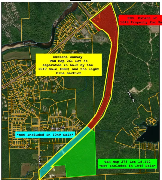 Rare opportunity for a residential development located in Conway, NH. 60+/acres of mostly level land with access to Route 303/113. Site will require well and septic and driveway approval. Located at a lighted intersection. Driveway permit from District 3 would be required for any proposed driveway. Buyer will be required to survey the property at Buyer's expense. Perpetual trail easement and right of way, plus use of Stritch Rd to Conway Lake cannot be restricted. 4 Room Cape built in 1954+/- No SF available, The Cape is in poor condition and no interior showings will be permitted. Please see additional disclosures attached.