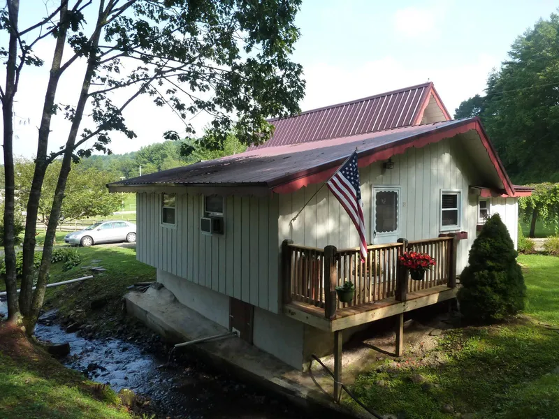 Mountain cottage for sale at Kanawha Valley. This home is currently set up to sleep 7 comfortably. The master bedroom has a double bed. The office/guest room has a single bed. The loft has a double bed and the detached bunkhouse has a double bed and adjoining full bath. The home is situated on 1.4 acres in Carroll County, VA with a small stream running by the rear deck and screened porch. There are multiple outbuildings that can be used as storage or workshops with each having electricity to them. The property is located at the entrance to the Kanawha Valley Arena and Kanawha Valley sub-division but is not part of either entity. This means that you can be close to all the action but have no association or road maintenance fees. The property is within an easy drive to Hillsville, Floyd, the Blue Ridge Parkway, and area golf and wineries.