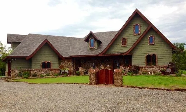 120 Acres with Washita River running through your back yard and a Storybook Style New Custom Home 4031 sq. ft 3 bed 4 bath with all the Extra character and charm! Home has many extras such as game room/ home theatre room upstairs, gun room/craft room complete with built in storage and much more storage available also upstairs is equipped with its own bathroom! Looking down the staircase is a very large and inviting family room with a top notch equipped kitchen two separate stoves one is convection and warmer. The sink is a stainless steel barrel one chamber with pull down sprayer, eating bar and large walk in pantry. Owners will leave the 10 person dining room table along with the coffee table. The fireplace is like none you have seen it has an extra large box equipped for some home style cooking! The ceiling is made from palette wood it's very unique and beautiful. This home also is energy efficient with special added R factor windows, shingle roof and siding both with 60 year warranty, the home is built with river rock and natural Oklahoma stone along with 100 year old reclaimed Brick. This house was built with concrete block construction and has proven to be energy efficient with an average of $180-200 monthly electric bill, what a savings for this large home!