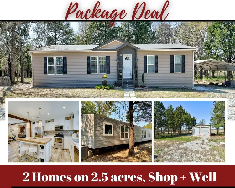 Two Southern Oklahoma Country Homes on 2.5 acres - Limited Offering for Cash Buyers Only! Have you always dreamed of finding a pretty piece of land one day with lots of trees, clearing out the ones you don't want, and making it your own little private retreat? With this place, all the hard work has been done for you. Selected trees have been cleared, water well installed, septic systems in place, storm shelter, and shop have been built. This unique property offers not ONE but TWO 2018 Clayton mobile homes with modern open floor plans nestled on 2 wooded acres in Dickson, OK. The doublewide mobile home, with 1,680 sq ft offers a beautiful view from both the front and back windows, offering an abundance of natural light. It has four spacious bedrooms/ 2 bathrooms, and the master bathroom has a corner soaking tub, large tiled shower, two closets, and double vanities. The living room has an...