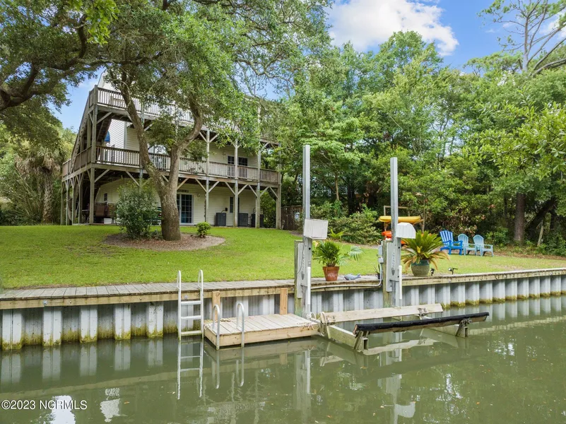 Stunning WATERFRONT INCOME PRODUCING property tucked away from the main road. Grab your cast net and catch shrimp from your own personal dock or hop on your boat or kayak on one of the few canals that lead directly to the Bogue Sound-ICW. This property is only a four minute walk to the ocean and has two quiet beach accesses points. Featuring 1970 immaculate square feet this home offers 3 bedrooms, a bonus room and 4 full bathrooms. This home has nice furniture and luckily for you it is selling fully furnished! Three entry points to all three levels via multi-level porches. Reversed floor plan, level one offers one bedroom, one full bathroom, and laundry. Each bedroom has a private porch allowing for spectacular views of the waterway, and an abundance of wildlife. The second level features the primary bedroom and bathroom with a large soaking tub, walk in shower and huge closet! This floor also has a third bedroom and additional full bathroom. The top level has a full kitchen, open living room, dining room, bonus room and a full bathroom. Entertaining on this level is endless with a large deck and screened in porch for a private oasis tree house feel ! Tile and oak hardwood flooring throughout each level, this home also features UPGRADES. This home has a reverse osmosis system to eliminate island water taste. New kitchen backsplash, stove and dishwasher. The exterior features include a walk in outdoor hot and cold shower with extreme privacy, low maintenance vinyl siding, 5,000lb boat lift and dock, two new HVAC units with smart thermostats, front & backyard irrigations systems, new decking on the third floor, ground level and around the property. This home has VERY low utility bills and is located on high ground with no flood insurance required. If this isn't enough, when the owners couldn't travel to this oasis, it was used as investment property generating 70k in the last two years. Let this home be your next residence, vacation or investment property!