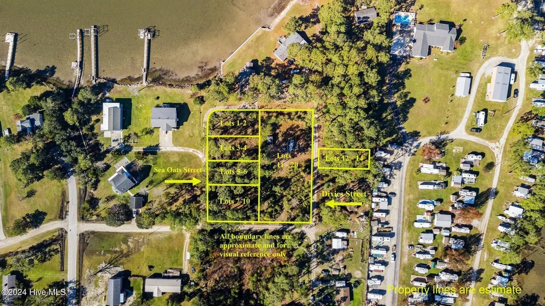 Per County records and seller disclosures, Sea Oats St. and Dixie St. include public water access points, perfect for light water activities and some of the finest fishing, crabbing, oystering, and shrimping around! The main parcel, 125 Dixie St., is partially cleared and ready for a build with installed electricity, a three-bedroom septic system, and a drinking well. There is a survey attached to show that the lots can be subdivided to build smaller homes as a great rental investment opportunity.
