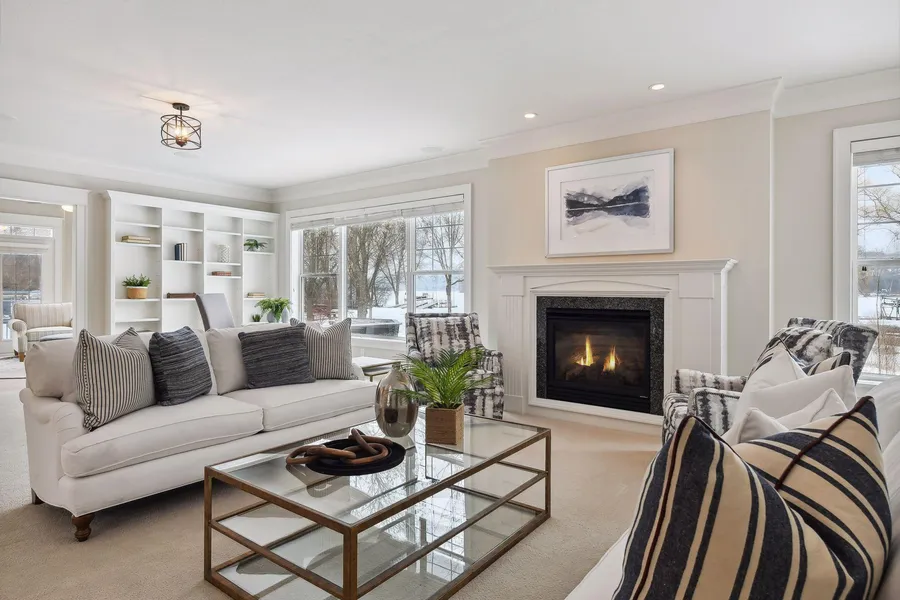 Recreational lakeshore at its finest - over 120 feet of shoreline on private Schutz Lake. This stunning one level living home has been beautifully refreshed with new hardwood floors, white enameling, paint, carpet and more. Water views from nearly every room. Open concept eat-in kitchen with large center island, stainless steel appliances and large pantry. Main level master with ensuite bath and walk-in closet. Additional master suite option on upper level with private office/sitting room. Four bedrooms up, all with ensuite baths. Upper level also features incredible family/great room and bonus room - perfect spaces for theater, office, play room or exercise room. 3-car heated and insulated garage. 2+ beautiful acres with charming bridge over to dock. Enjoy living on one of the most private lakes in Minnesota. Located on a private drive with easy access to Highway 5.