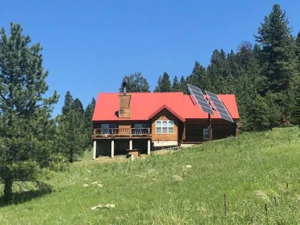 Current owners live here full-time, off the grid, with an extensive, professionally installed solar system, propane, fireplace insert, propane heaters and back-up generator. R54 insulation in roof; handsome red metal roof. French drains; two car garage; soaring ceilings! This is a really nice set-up, which has been well-maintained but does need some simple finish work.