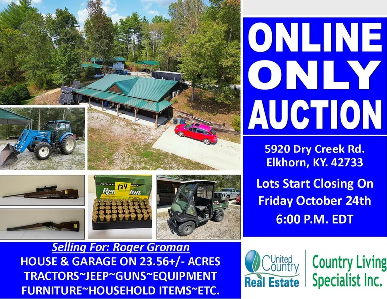 Home with detached garage/workshop sitting on 23.56+/- acres in rural Casey County Kentucky. The home was built in 2017 and has one bedroom with large walk in closet along with a second space that could be used for an additional bedroom however does not have a window. Large open concept living room and kitchen in the main living space. The master bedroom has a double door entrance from the outside as well as the living room along with huge walk in closet and attached master bathroom. Behind the kitchen is another office space and adjoining the living room at the other end is the laundry room, pantry and half bathroom. The front of the home has a large covered porch giving an excellent area for sitting and enjoying the outdoors. Behind the home is a large 24'x44' three bay garage with car lift in one of the bays, concrete floor and electricity. The property contains 7-8 acres of pasture with the remainder in woodland. Would be an ideal location for a horse/cattle farm or for other livestock. Seller has had recent appraisal conducted in August of this year with a value coming in at $405,000. This appraisal is attached to the lot on this auction.