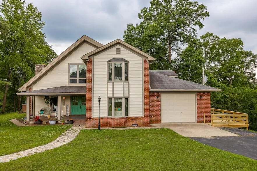 Right here in Kentucky, you can find a little slice of Gatlinburg! This meticulously crafted residence is now on the market. Built with great care and dedication by the current owner, it has been his cherished home for more than three decades. The spacious house features a two-story Great room, complete with an upstairs walkway from the bedrooms that overlooks a grand fireplace. Unique to this home are the dual staircases front and back with the rear staircase providing direct access to the kitchen and dining area. On the first floor, there is a bedroom and bathroom, while the second floor houses four bedrooms and another bathroom. Nestled on a private 2-acre plot bordered by forest and abundant wildlife, the property offers tranquility and seclusion. A 20 by 40-foot inground pool provides an ideal setting for entertaining or simply enjoying peaceful moments. Recent updates include new flooring in the den and the downstairs bathroom. If you're seeking a quiet retreat with plenty of space between neighbors, this could be the perfect home for you!