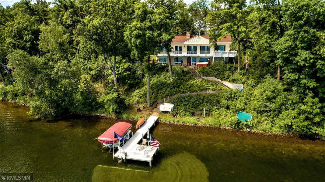 Gull Lake Views as Fabulous as they come! The second you step into this home you are drawn to the view up the entire expanse of Gull Lake, which every room is designed to take advantage of. The end of peninsula location provides sunrise views to the east as well as sunset views to the west from the sunset deck. Adjacent homes are set in such a way to provide a privacy buffer on both sides. The modest elevation is well handled by a short switchback of wide stairs and landings to the more level beach area. Even the dock and swim raft are included! Enjoy the amenities of the Association and the nearby resorts of Maddens and Craguns with world class golf and dining just a golf cart ride away.