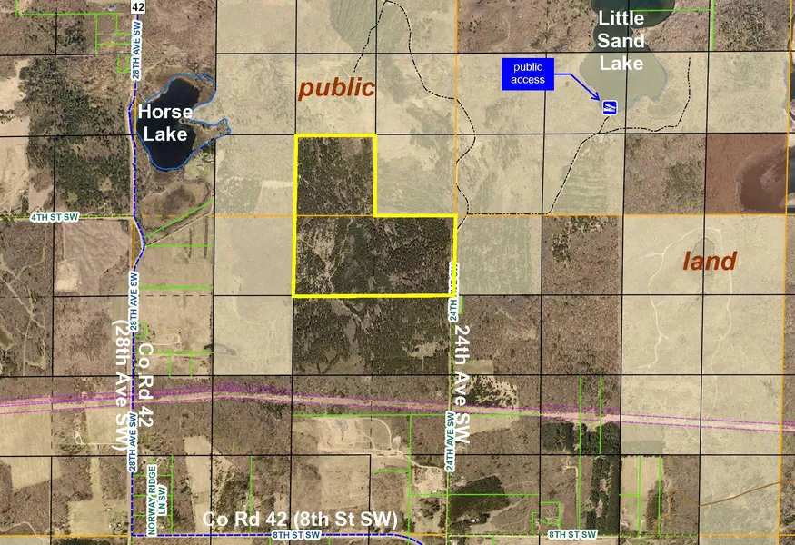 Rural PotlatchDeltic land by Little Sand Lake and Horse Lake north of Pine River. Upland with rolling topography and wooded with red pine, jack pine, and aspen. Gravel township road along the east side. Public land adjoins the north, west, and east sides for plenty of hunting, ATV riding, and snowmobiling space. Public access to Little Sand Lake only 1 mile away. Utilities are within 1/4 mile.