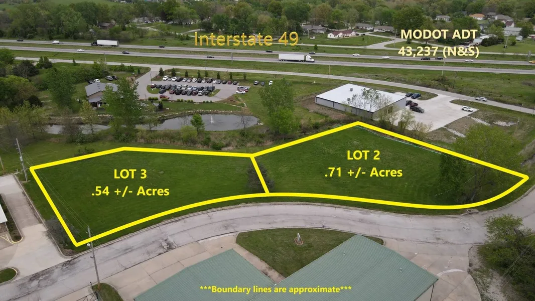 Two commercial lots being sold together in Peculiar, Missouri. Totaling 1.251 +/- acres, these lots offer great access to multiple state highways, as well as a major interstate. The lots can be easily seen from the interstate. Utilities are available at road frontage.