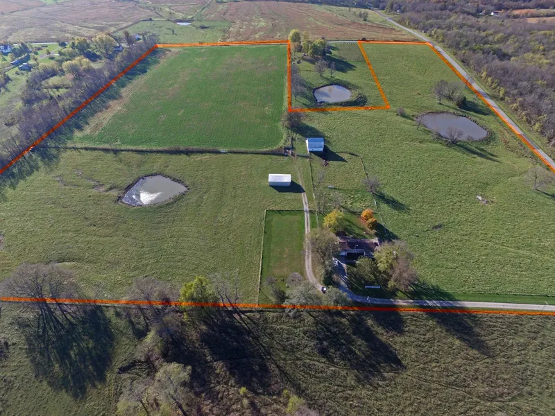 Location is key on this wonderful home situated on 32.3 acres between Pleasant Hill and Lone Jack. With roughly 1,300 feet of State Route E and 800 feet of E 161st Street road frontage, the opportunities are endless. The ranch style home consists of a master bedroom, guest room with a pocket door, a sunroom front porch, and a living room on one side. On the other side you will find a full bath, bedroom that is currently being used as a den, kitchen, enclosed breezeway/laundry room that connects the 2 car garage to the home, and a mudroom off of the back of the house. There are many hallway closets and an attic above the garage for increased storage. The home sits on a basement with wood shelving that will go with the home, with new plumbing and almost entirely new electric. The property is fully fenced and cross fenced for cattle or horse grazing, with a 35’x41’ flat barn for storage and a 42’x24’ barn for livestock. The southeast field is 12.45 acres of tillable currently planted in alfalfa and farmed by a local farmer. There are 2 ponds on the property to provide water for livestock or fishing. An extra feature that the sellers installed is a Dakota driveway alarm system to alert you if anyone comes up the drive.
