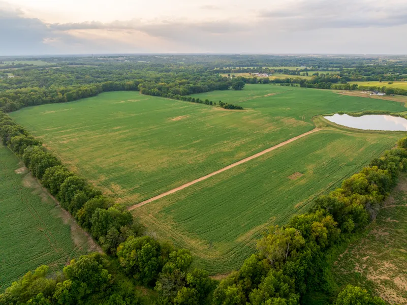 Approximately 108 +/- acres are tillable, featuring fertile soils and competitive cash rent. Another 28 +/- acres of mature timber provide cover for wildlife, along with excellent deer and turkey hunting. The property is fenced and well-suited for multiple uses. Recreational appeal is highlighted by 4.6 surface acres of stocked water, plus additional creek frontage. Panoramic views stretch across the South Grand River bottoms, with an elevated homesite offering a stunning vantage point. The gently sloping terrain delivers over 50 feet of elevation change, adding both character and beauty.