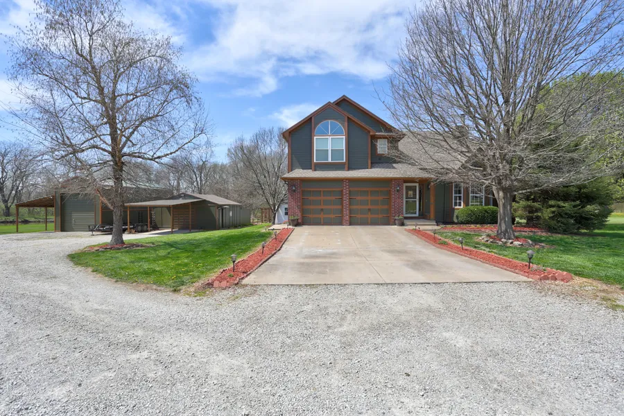 This beautifully maintained 4BR 3BA California split on 3.2 acres near schools in Raymore has it all. A wooded lot with a bridge over a meandering stream is just the beginning. Live the good life with your heated in ground pool with access from your walk out basement. Enjoy the deck overlooking the pool spanning the length of the house. Enjoy hobbies and store your toys in the outbuildings. In the winter warm yourself with the two fireplaces as you choose between your family or living room to enjoy your home.Be sure and see drone video.