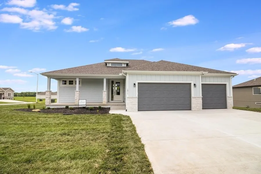 Gorgeous new construction in The Estates at Knoll Creek by Drumm & Riegert Homes! This reverse 1.5 story home blends custom design with modern comfort and energy efficiency. The covered front porch leads into a welcoming foyer and an open-concept main level. The great room boasts tall ceilings, a cozy fireplace, and oversized windows that flood the space with natural light. The heart of the home is the impressive kitchen with custom cabinetry, a large island, gas cooktop, wall oven, and a walk-in pantry—perfect for cooking and entertaining. The primary suite is stunning with a serene backyard pond view, and the ensuite bath offers a spa-like escape with a soaker tub, tiled shower, double vanity, and access to a spacious walk-in closet that connects to the laundry room. Downstairs, the finished daylight basement features 3 additional bedrooms, 2 full bathrooms, a family room, wet bar, storm/safe room, and ample storage. Step outside to a large covered deck overlooking the peaceful community pond. Located in Raymore—just minutes from Kansas City—this friendly, growing town offers top-rated schools, shopping, dining, parks, and walking trails. Don’t miss this incredible opportunity!