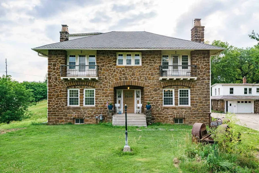 One of a kind stone home on a quiet acreage in the middle of town. Best of both worlds. Look for butler pantry, dressing rooms, balconies, extra wide staircase, lots of amenities! Bathrooms for all 3 bedrooms. Heating and A/C system is dual zoned. Close to schools. Carriage house "as is".