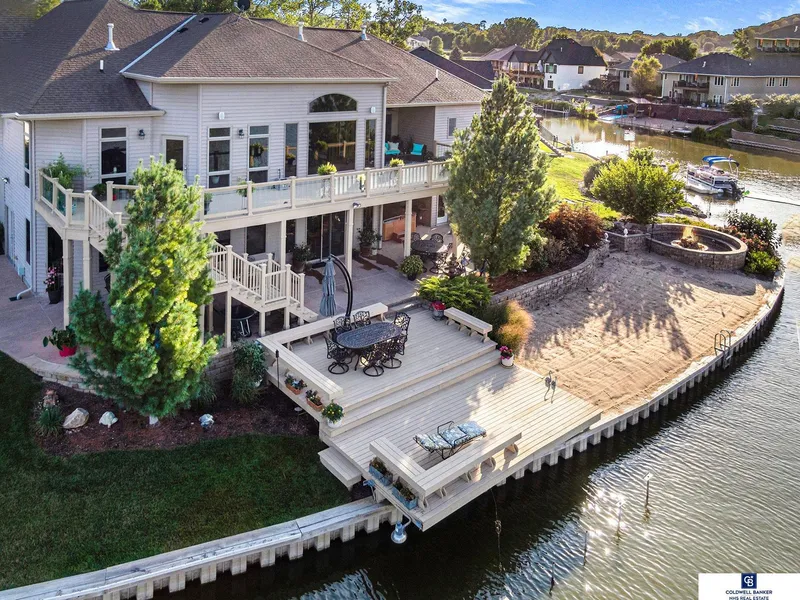 Executive ranch on half an acre with 180’ LAKEFRONT! The attention to detail in this custom build is impeccable! Original owners have kept this home in pristine condition. Living Room entry boasts 13’ ceilings with custom wet bar and stained glass. Kitchen with solid maple cabinets, tiered recessed lights, walk-in pantry with outlets, breakfast bar, center island, tile backsplash, hearth area with fireplace and door to deck. Luxurious suite on main floor with French doors, fireplace, tiered 14ft ceiling, jacuzzi whirlpool overlooking the lake, heated towel rack, separate toilet, walk-in linen closet, and walks out to covered composite deck with ceiling fan. Finished walkout basement includes WINE CELLAR, 4th fireplace, kitchen, theatre room, bedrooms, exercise room, and utility shop with side exterior door for easy access. Professional landscaping with water feature, patio with sunken fire pit, beach, and two large decks provides the ultimate entertaining space!