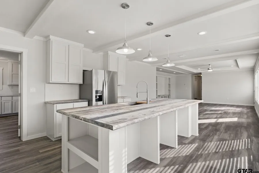 Welcome to Hughes Springs! Come explore this stunning brand new modular home boasting 4 bedrooms and 3 baths. As you step inside, you'll immediately notice the attention to detail, with built-ins adding a touch of elegance to the spacious living room. The chef's kitchen is truly a dream, featuring an oversized island, new stainless appliances, and an abundance of cabinet space for all your culinary needs. The primary suite is a luxurious retreat, complete with an ensuite bath and impressive walk-in closets, providing ample storage for your wardrobe. Outside, a large front porch beckons you to enjoy your morning coffee while taking in the peaceful surroundings. Whether you're looking for a peaceful escape or a place to entertain friends and family, this property offers the perfect balance of comfort and style. Don't miss the chance to make this new modular home in Hughes Springs your very own! Schedule a showing today and prepare to be impressed!