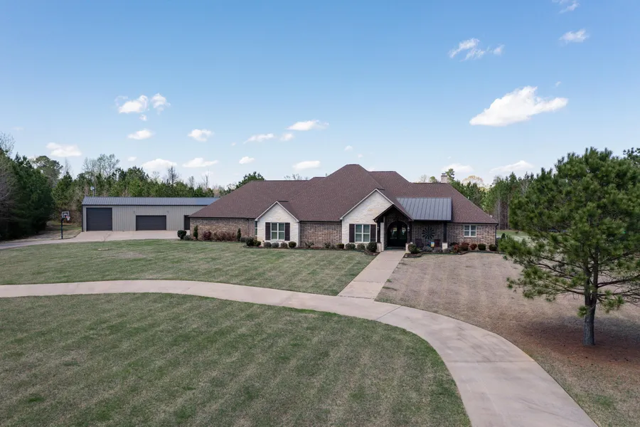 This magnificent Brick/Stone Modern Ranch home features a 3,910 sq ft heated "open concept" and 6,100 sq ft under roof design. It has 4 bedrooms, 4 1/2 baths, Game Room/Media Room, Covered Outdoor Cooking Entertaining Area with Pool, 3-Car attached Garage, Shop/Storage Building, Indoor Multi-sport Practice Room, and 525' Deep Well on 20 Acres (with an optional additional 15 Acres available) is just the tip of the ice burg!