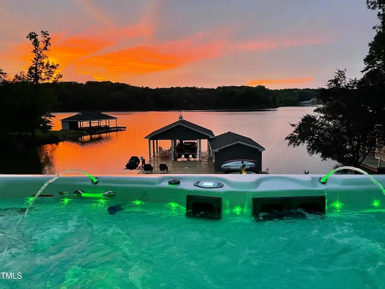 Luxurious Cottage on Hyco Lake - Million Dollar Views! Escape to your own private retreat on Hyco Lake, where breathtaking views and unparalleled craftsmanship await. This stunning cottage is nestled on a beautifully landscaped lot, accessible via a winding paved driveway that sets the tone for the elegance within. As you step onto the front porch, the quality workmanship and upscale finishes are immediately evident. Once inside, prepare to be wowed by the panoramic lake views that greet you. The spacious dining room features a striking chandelier that adds a touch of elegance, while the gourmet kitchen is equipped with a high-end Wolf range for the discerning chef. The main floor boasts a cozy bedroom with a lake view, along with a beautifully updated bathroom. Upstairs, you'll find a versatile loft with its own lake view, an updated bathroom, and a second bedroom. The loft offers potential as a third bedroom, and the septic system is rated for 3 bedrooms, providing options for expansion. Step outside to the expansive deck, where you can unwind in the swim spa with stunning lights and fountains or enjoy the firepit area for those cooler evenings. The extensive hardscaping leads you to a double slip boathouse with good water access, perfect for all your lake activities. Additional features include high-speed Spectrum internet, an irrigation system, a tankless water heater, and a generator, ensuring comfort and convenience year-round. Don't miss out on the chance to own this extraordinary Hyco Lake retreat, where every detail has been thoughtfully designed for ultimate relaxation and enjoyment.