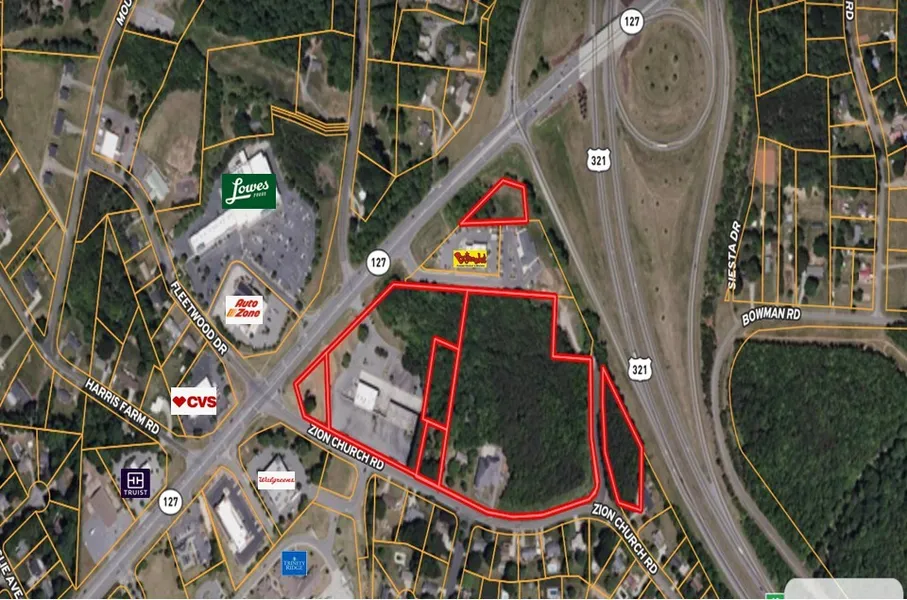 Excellent opportunity to purchase a total of 19.75+/- acres at the corner of Highway 321, NC Hwy 127 South and Zion Church Road. These 7 parcels combine currently consist of 2 large commercial office/retail buildings (Building #1 built in 1980 and Building #2 built in 1994), a residential duplex, 3 unoccupied homes and four vacant land parcels. The property is one mile from I-40 and has high visibility opportunities on Hwy. 321. The office/retail buildings are mostly vacant and current tenant is on month to month lease. All of the properties are currently zone CC-1 which provides the opportunity for multiple uses. Ideal location for a large corporate office, redevelopment into a mixed use development or regional medical center. The total tax value of all the properties is $4,055,500. All utilities are available on-site. Quality retail, dining, residential surround this property. Easy access to Hwy 321 and I-40. This property is shown by appointment only.