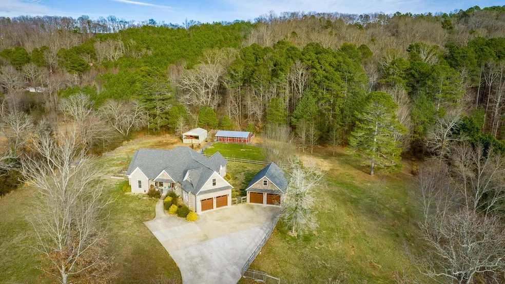 Beautiful like new home on 9.5 acres with detached garage, barn and ready for your hobby farm! You'll fall in love with this property as soon as you turn into the long driveway that takes you up the small hill to the homesite. As you step inside the front door you'll immediately notice the expansive open living room, dining area and kitchen. Beautiful hardwood floors, coffered ceiling, stone fireplace, open stair case and a wall of windows create a space that everyone will enjoy. The bright kitchen features a very large island, stainless steel appliances and granite counter tops. Off the main entry you'll find a spacious office and large laundry room. The master suite is very large with it's own entrance to the back patio, tile shower, separate soaking tub, separate vanities and large walk-in closet. Two more bedrooms share a jack-n-jill bathroom on the opposite side of the home. Upstairs you'll find a very large bonus room/4th bedroom with it's own full bathroom, a large storage closet and huge walk-out attic space. The covered back patio is perfect for relaxing and looking over your private back yard that is currently fenced with a 3 stall horse barn, ready for your animals! This lot is totally private with no homes behind you and some of the acreage is in the woods, providing space to expand or shade and exploration opportunities. The extra large detached garage has plumbing and is perfect for storage, work shop, or man cave/she shed! Located just minutes to shopping, dining, schools and health care, this home provides the country feel without being in the middle of no where!