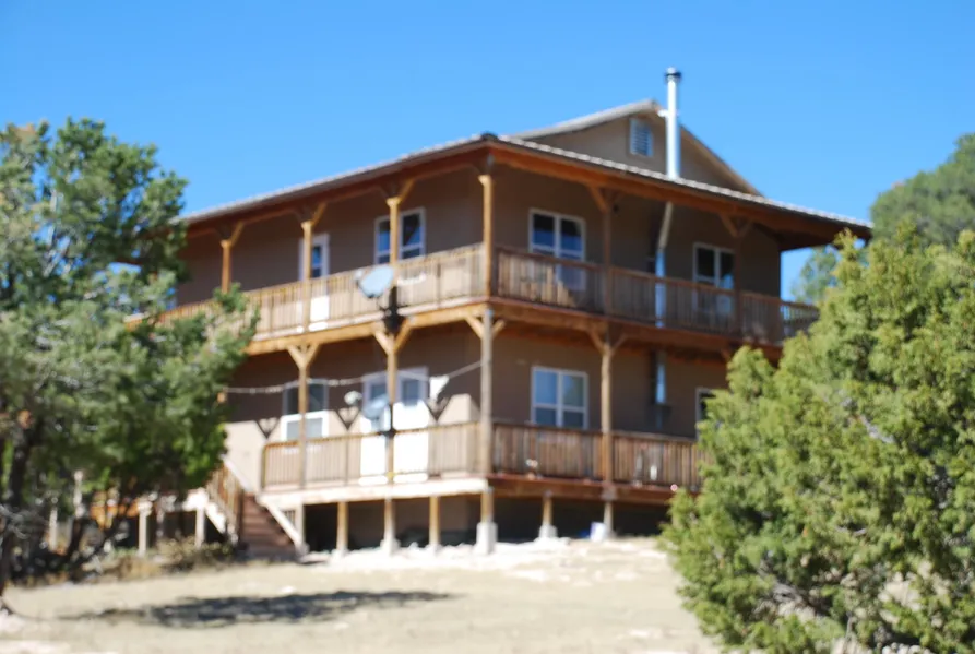 Commanding 2-story lodge on 100 acres, was completed in 2009, about a mile from National Forest in New Mexico's Big Elk Hunting Unit 15. This house is like new inside and out, all-weather deck boards on platforms which wrap around the south and east sides on both levels, metal roofing, laminate wood floors throughout. There are 3 bedrooms with a very large Master Bedroom and bath, and a 1,547 sf cellar to store food and supplies.