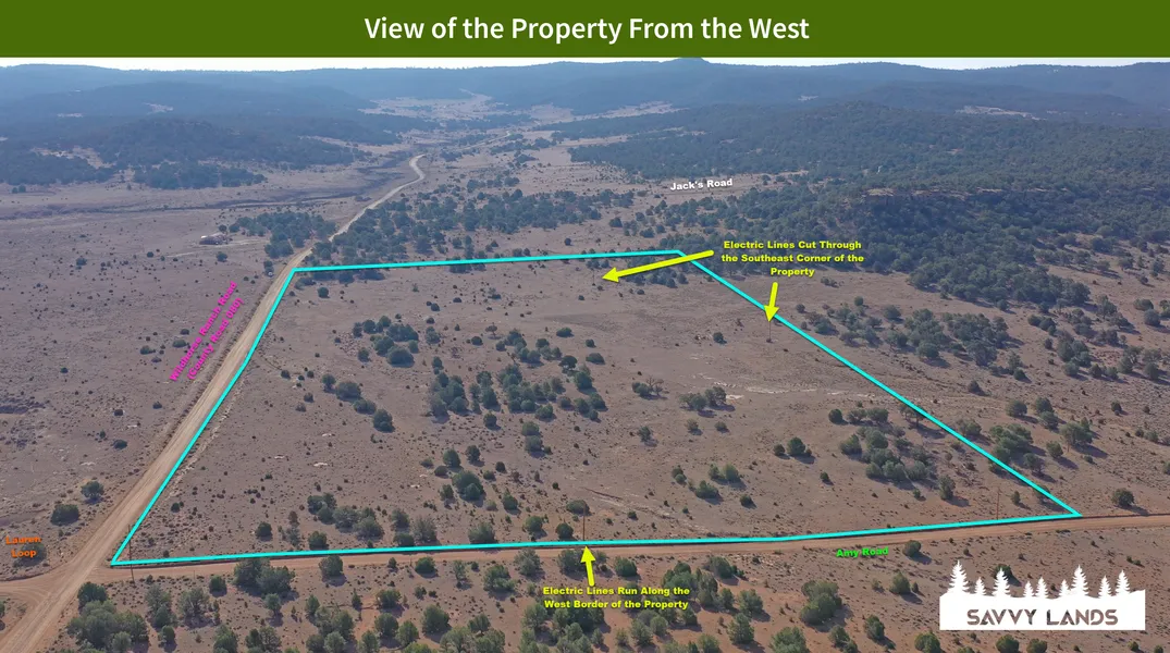 - Power lines run along the southern and western borders of the property and cut through the southeast corner of the property.