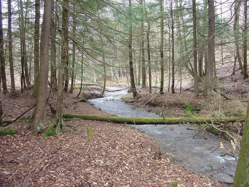 New York land with timber, stream and trails for sale: The property has more than 1,000 feet of road frontage on both sides of Indian Creek Road. No electric is available at the highway. The property is completely forested on both sides of the highway. It has been involved in long-term forest management for decades. The forest is comprised of soft maple, hard maple, ash, hemlock, cherry, red oak, basswood and beech as the primary species. A timber cruise made in June of 2015 shows a total volume of approximately 664,900 boardfeet of timber, International ¼ inch log rule with a timber capital value at that time of approximately $164,500. Timber was last harvested about 5 years ago. Access is given throughout the property by an extensive network of logging roads, all in good condition making for ease of access by ATV for hunting and recreational uses. The North Branch of Indian Creek is a full-time flowing stream that parallels the road frontage on the west side of Indian Creek Road. The property is located in an area of good hunting near “Rock City” south of Olean and also has thousands of acres of public lands nearby. The Pennsylvania state line is only minutes away for those that like to recreate on both sides of the state line. This property makes for a solid long-term timber investment while gaining the enjoyment from the hunting and recreation it and the surrounding area has to offer. The oil, gas and mineral rights are previously reserved and will not transfer. Timber rights will transfer.