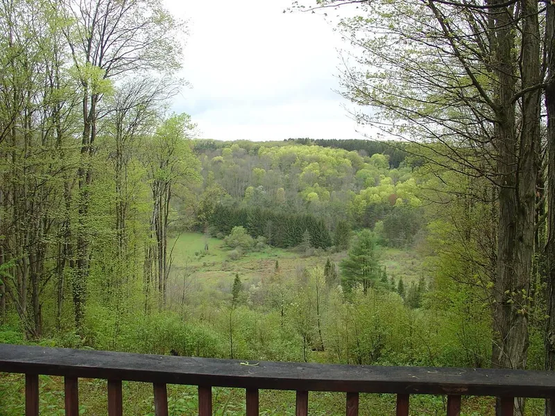 Also included is an older 24’x 32’ insulated wood frame cabin that sits about 1,200 feet back in from the road creating total seclusion. The cabin is an open floorplan inside and has modest furnishings. This is a rustic hunting camp that needs TLC on both the interior and exterior. There is a bathroom with a shower stall, but there is no water well currently. There is plumbing installed in case someone decides to have a well. The owner brings water for drinking and for showers. There is electric to the cabin and they also have Directv. There is a nice wrap-around deck on the structure that has a valley view from the back of the camp.