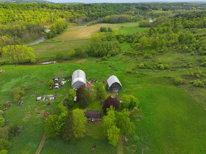 Located on a secluded but maintained road, this 95-acre farm sits back along the Cattaraugus Creek offering multiple opportunities for its next owner. The property is split up by approximately 50 acres of tillable land which is farmed annually, and approximately 40 acres of scattered woods, brush, overgrowth, pond, and around 5 acres of lawn surround the house and outbuildings. The outbuildings consist of a 40 x 50 barn which can be used for cattle or storage with a loft that was previously used for hay storage. There is a 36 x 26 milking parlor and workshop that connects to a 50 x 100 arched steel building that can be used for stalls for cattle or for storage.