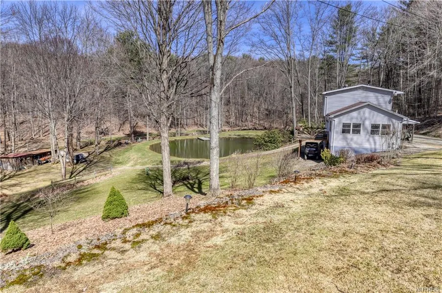 Private county year round retreat! 3 Bedroom, 1.5 bath home on private 3+ acre's over looking spring fed pond and stream nestled in the Allegany Mountains with HIGH SPEED INTERNET. Mid level entry with updates through-out. Every window offers amazing views of the property. Watch the 30 year old Koi fish swim in your private pond from the back deck or relax by the stream under the shade of the mature maple tree's. Newer kitchen offers solid oak cabinetry and well designed layout. 3 bedrooms and full bath on second floor. Lower walk-out has the potential to be finished to add additional living space or recreation room, office or studio. Property offers the option of both high efficiency propane and rice coal furnaces. Seller has done extensive landscaping, grading and planted countless perennials on property. New septic. Sugar shack / outbuilding is ideal for storage or backyard studio.