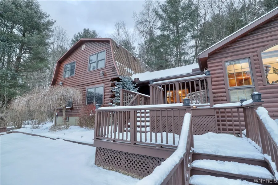 This warm and welcoming home sits hillside with surrounding nature views at every turn. First floor primary suite, two gorgeous fireplaces, full entertaining/living additional space. Choose to relax on the front, rear, or side deck each providing its own view. The primary suite area is generous in size and provides privacy enabling to be a possible in-law area or guest area. Upstairs features three bedrooms and a full bath. Venture downstairs to the entertainment/living area with fireplace, full bath, and outdoor deck. Large kitchen and eating area combined with additional dining area/living space. Hot Tub nights under the stars or stay cool in the enclosed patio room. All blinds in the home are new and custom sized. No lack of storage space in this gem either: Lots of closets, storage space, and storage area. This house is AMAZING! Surrounded in beauty yet just a few minutes away from downtown shopping, grocery, and restaurants. 20 minutes over the hill to Bradford - 3 minutes to downtown Olean - 15 minutes to Allegany - 20 minutes to Cuba Lake - 35 minutes to Ellicottville. Perfect location!