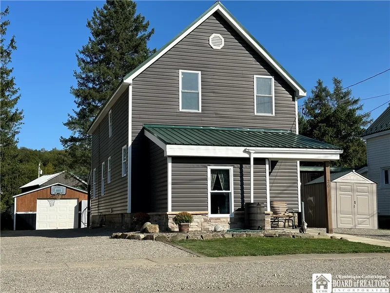 Welcome to this beautifully remodeled and meticulously maintained 1,220 SqFt home, nestled on 0.14-acre lot in the charming Village of Franklinville! This residence is a true showcase of craftsmanship, featuring an array of stunning woodwork throughout. As you approach the home, a front covered entrance welcomes you into a mudroom. Moving to the main level, there is office space ideal for work or study. The kitchen, a chef's delight, with custom countertops and ample workspace. Adjacent to the kitchen, the dining room has a custom-built dining table with convenient storage underneath. The spacious living room, with sliding glass doors, offers a view of the backyard, and a conveniently located laundry room with a half bath enhances the home's practicality. Upstairs, discover three comfortable bedrooms and a full bathroom. The full basement offers ample storage space and houses the utilities, with flexible heating options via gas or wood. Outside, the back covered patio is perfect for cookouts or simply unwinding plus the stoned area invites you to enjoy campfires under the stars. The spacious backyard offers plenty of room for entertaining or relaxing in a peaceful setting.