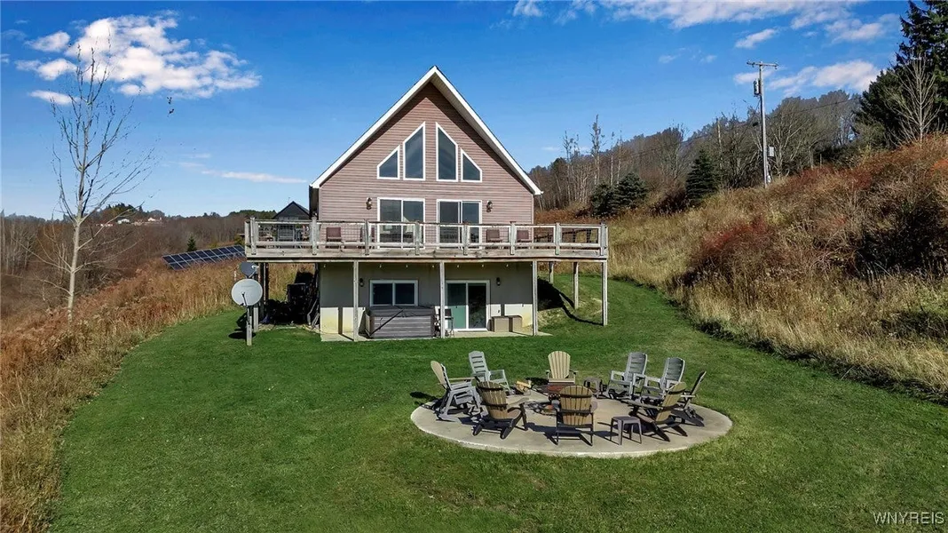 Escape to your own private paradise with this stunning 5-acre chalet, offering breathtaking 360-degree views of nature and the ski slopes of Holiday Valley and Holimont. Perfect for those seeking peace and seclusion, yet only 1.3 miles from the Village of Ellicottville, this entertainer's dream home provides the ideal blend of luxury and privacy including a huge outdoor fire pit overlooking the mountainous terrain surrounding you. Boasting 5 spacious bedrooms, 3 full bathrooms, and over 2,800 sq/ft of living space, this home is designed for both relaxation and entertaining. The main floor features a spacious primary ensuite bath, plus an additional bedroom, an open kitchen with granite countertops/custom cabinetry, first floor laundry, and a cozy family room w/ gas fireplace with spectacular views leading to a large deck. The newly remodeled walkout basement offers additional recreational space with bedrooms and a full bath. Brand new high efficiency furnace as well as new water filtration system. The 2nd floor loft overlooking the family room and ski slopes provides extra space with a large bedroom. Whether you're hosting guests or simply enjoying the serenity of nature, this chalet offers it all including ample off street parking for 5+ cars.