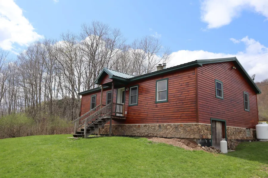 It is not very often a large parcel this close to town comes up, and this one is a special one! Only 3 miles south of Olean, NY, this getaway delivers country living just 5 minutes from all the conveniences of town. A rustic décor home or lodge is perched beautifully overlooking half of the property to a mountain view to the south. Upon entering the home you are greeted by a warm wood stove with stone chimney, with tongue and groove pine walls and ceilings. The great room (24’ x 12’9) has a vaulted ceiling and is kept company with an open concept kitchen (13’ x 12’9) giving you a much larger feel in an already big space. The kitchen has modern recessed lighting between exposed rough beams and is balanced perfectly with an antique enamel sink, faucet and gas stove. Hardwood floors lead you to the master bedroom (12’11 x 12’11) and on to the second bedroom (12’9 x 7’9) through the hallw...