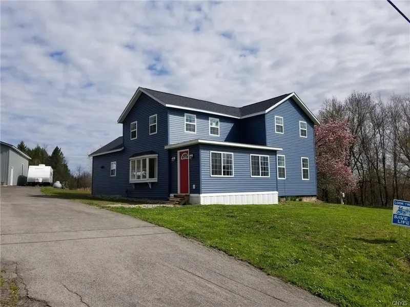 Welcome home! This Home has had many up dates in the last three years. New pole barn 30x48 w/floor and electric . House is now tied into village septic. Roof and windows ,Furnace and hot water, all appliances just to name a few up-dates. Three bedrooms, two living rooms or use one as office. big eat in kitchen, breakfast bar with sliders to backyard.First floor laundry and full bath . Upstairs has room for new bathroom it is not completed owner is working on this home daily.2 big bedrooms up with pass through room that can be used for sitting room or office. beautiful enclosed porch with Red front door. Plenty of parking.5.90 Acres to enjoy! I have plenty of photos just ask for extra photos I will email them to agent.